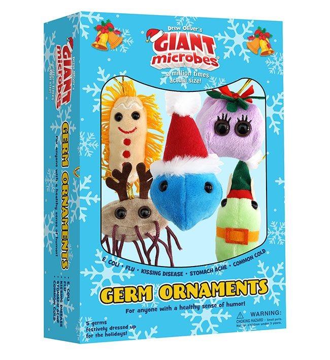 5 germs festively dressed up for the holidays! Decorate your tree or house with these memorable special edition microbes with golden loops for hanging. Germ Ornaments themed gift box includes: •E. coli with reindeer antlers • Flu dressed up as an elf with hat, ears and belt •Kissing Disease with a mistletoe hat •Stomach Ache as a gingerbread man with buttons and embroidery •Common Cold with classic Santa hat